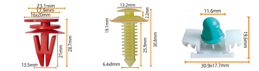 Plastik sürətli buraxılış klipləri: bədən panelləri, bamperlər, təkər arch laynerləri və s. Bu kliplər ümumiyyətlə yüksək temperaturda davamlı, yüksək güclü plastiklərdən hazırlanmışdır və hissələri düzəltməyi və ya dəyişdirməyi asanlaşdıran sürətli bir funksiya ilə hazırlanmışdır.